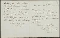 Clemens, Samuel (1835-1910), also known as Mark Twain. Letter to Mr. Macgowan, written in “franglais,” accepting invitation to dine at restaurant in Paris, with later annotation by recipient. Circa Feb 6, 1895 (annotation added Feb 10, 1895), 169 rue de l’Université. Manuscript, ink on paper. 1 piece, leaf 12 x 18 cm (writing on 2 pages).