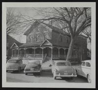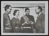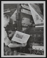 Item 45: Lawrence Jaycees - (L to R) John B Harris, Lyman Wiley, Dr. Dale Sillix. Item 46: Historic Houses - Dix House at 717 Vermont Street razed. Home of Dr. A. J. Anderson for many years. Item 47: Pulled to University Archives. Item 48: Lawrence Fire Department - (L to R) Mrs. Don McConnell, Mrs. C E Kerns, Fire Chief John Miller, Mrs. Carl Gray Jr. Item 49: Patricia Plummer engaged to Joseph M. Swarner. Items 50: Lawrence Journal World - Moving machines to new quarters. Item 51: John Wulfkuhle, of 512 Louisiana street. Item 52: Journal World moving (L to R) E. L. Doxtater, an employee of Printing press company, Dallas Dolan, Bud Schmitz, in front of Dolan. Item 53: Lawrence Journal World - Printed on Leavenworth Times press during move. John Gonterwitz. Item 54: (L to R) Judge Frank Gray, Mrs. Leland Pritchard, John Pritchard Receiving eagle scout badge, Raymond Nichols, Chair of Tauy District.