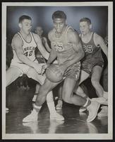 Item 22: City - downtown Kroger Store - Ninth and NH. Item 23: LHS Basketball - vs. Highland Park. Doyle Schick (42) and George Whitney (25) rest unidentified Item 24: Haskell Basketball vs. Holton (L to R) Lyle Johnson (55) (Holton); Richard Powell (center); Elliott Ryall (22). Item 25: Lawrence Schools - Junior High drama class - Twelfth Night tableau - South Park. Item 26: Kansas Turnpike - View to SW from under Fisher Memorial Bridge. Item 27: Pulled to University Archives. Item 28: Pulled to University Archives. Item 29: LHS Dance for students, parents and teachers - J. F. Schubert and Daughter Marilyn. Item 30-31: Pulled to University Archives.