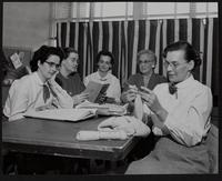 Item 74: Residential Fire Safety Program - (L to R) Chief John Miller; O. D. Brubaker; Capt. Clarence Flory; Assistant Chief Fred Sanders. Item 75: Pulled to University Archives. Item 76: Cadet Riley R. Moore receives congratulations from Brigadier General Throckmorton. Item 77: Lawrence Stores - New grocery to be built at 9th and Iowa Streets - Rusty Springer and J. R. Cole. Item 78-79: Pulled to University Archives. Item 80: Politics - voting was light in some precincts - East Heights School Judges (L to R) Mrs. Virginia Campbell; Mrs. Betty Mole; Mrs. Ada Tornedan: Mrs. Lorene Hollingsworth: Mrs. Miriam Abegg. Item 81: Weather - warm weather - Mrs. Darwin Malott - garden hose spelling of spring. Item 82: "Miss Lawrence" Pageant - LHS candidate for queen - Jane Perry. Item 83: Lawrence Journal World- carriers get free ad (L to R) Mrs. Norma Thomas: Jack Starkey; Frank Hess; Ernest Pontius. Item 84: Pulled to University Archives.