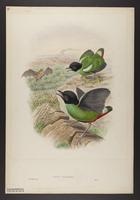 Pitta sordida forsteni -- Hooded Pitta. Alternate name on piece: Pitta forsteni [Forsten's pitta] Colored litho print. MS notes by bookseller, Sotheran, at foot of sheet: N.G. IV.30 / unpublished in Monograph of the Pittidae. Artist's name(s): Gould, John; Hart, William Matthew.