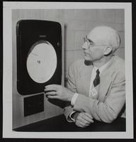 R. A. Garrett, meteorologist in Topeka weather office checks JW thermometer.