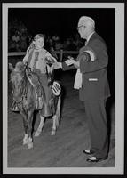 Lawrence Horse Show - Deanna Rogers on "Champ" receives ribbon from A. D. White of Ottawa.