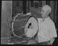 Baldwin - Battle of Black Jack - Drum damaged by gunfire carried in battle by Henry Barricklow - shown with T. A. Evans [not in box, summer 2021].