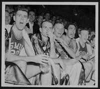 NCAA regional basketball (probably) - A. K State bench losing to Oklahoma City University team. B. O.C.U. team. C. SMU bench tournament winners. D. SMU vs. Houston. E. KSU v. Houston. F. same.