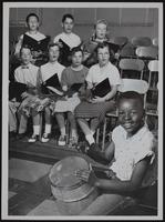 Lawrence All-School Music Festival - Leonard Vann with homemade drum - with vocal group - front (L to R) Tyson Travis, Cordley; Mary Lee Robins, centennial; Diane Thomas, New York; Karen Kolars, Woodlawn-Lincoln; Back row - Terry Turner, East Heights; Pamela Masters, Hillcrest; Carol Sullivan, McAllister.