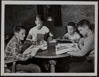 Scouts take time to study while at camp; (L to R) Paul Kincaid, Don Malone, Bobby Crown, and Joe Bales.