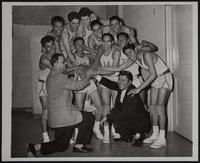Haskell basketball - Ready for the finals of state class A - (L to R) Coaches Tony Coffin and Assistant Rupert Thompson. Front row - Ken Bailey; Wayne Jimboy; Walter Postoak; Tom Sugar; Cecil Jefferson; Back row - Wayne Postoak; Eugene Black; Bob McCosar; Elliott Ryal; Willie Sevier.