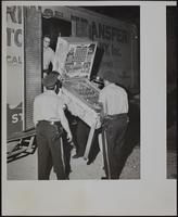 Officers unload part of loot. Loot taken from truck by deputy Don Hallmark. Also from left are Earl Harris, Virgil Foust, Don Andrews, Dt. Dick Stanwix, and Eugene Williams. 22 machines were taken in raid on local businesses.