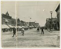 Massachusetts Street looking north, showing crimson and blue decoration for University of Kansas commencement