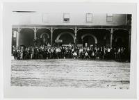 Large group of men with shovels in front of County offices attached to old Courthouse on Warren [8th] Street carrying signs