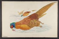 Drawing depicting: Phasianus colchicus -- Common Pheasant; Ring-necked Pheasant, faisan de chasse, Faisán de collar [Common pheasant]