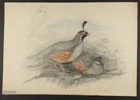 Drawing depicting: Callipepla gambelii -- Gambel's Quail, Codorniz chiquiri. Alternate name on piece: Callipepla gambelli