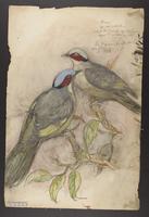 Drawing depicting: Ptilinopus fischeri -- Red-eared Fruit Dove. Alternate name on piece: Ptilopus fischeri [Fischer's fruit-pigeon]