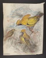 Drawing depicting: Sericulus aureus -- Flame Bowerbird, Masked Bowerbird. Alternate name on piece: Xanthomelus aureus [Golden bird of paradise]