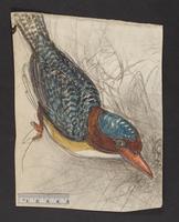 Drawing depicting: Lacedo pulchella -- Banded Kingfisher. Alternate name on piece: Carcineutes pulchellus