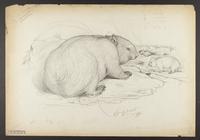 Drawing depicting: Lasiorhinus latifrons -- Southern Hairy-nosed Wombat. Alternate name on piece: Phascolomys latifrons [Broad-fronted wombat]