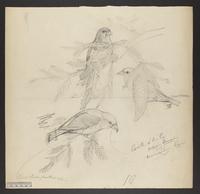 Drawing depicting: Loxia curvirostra -- Red Crossbill; bec-croisé des sapins, Picotuerto rojo, [Common crossbill]