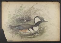 Drawing depicting: Lophodytes cucullatus -- harle couronné; Hooded Merganser, Mergo cresta blanca. Alternate name on piece: Mergus cucullatus [Hooded merganser]