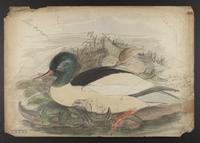 Drawing depicting: Mergus merganser -- Common Merganser; grand harle, Mergo mayor. Alternate name on piece: Mergus castor [Goosander]