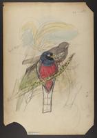 Drawing depicting: Trogon aurantiiventris -- Orange-bellied trogon. Alternate name on piece: Trogon surucua