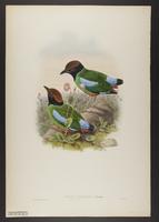 Drawing depicting: Pitta sordida cucullata -- Hooded Pitta. Alternate name on piece: Pitta cucullata