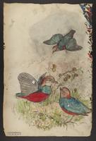 Drawing depicting: Pitta erythrogaster cyanonota -- Red-bellied Pitta. Alternate name on piece: Pitta cyanota [Blue-backed pitta]