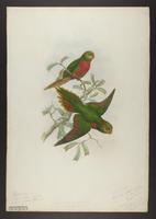 Drawing depicting: Neopsittacus pullicauda -- Orange-billed Lorikeet. Alternate name on piece: Trichoglossus musschenbroeckii [Van musschenbroek's lorikeet]