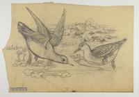 Drawing depicting: Phalaropus fulicarius -- Red Phalarope; Falaropo pico grueso, phalarope à bec large [Grey phalarope]