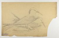 Drawing depicting: Sturnus sandvicensis -- Sandwich Tern; CharrĂ¡n de SandwichSandwich Tern. Alternate name on piece: Actochelidon cantiaca [Sandwich tern]