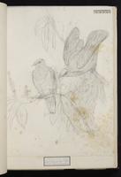 Drawing depicting: Ptilinopus regina -- Rose-crowned Fruit Dove. Alternate name on piece: Ptilonopus swainsonii [Swainson's fruit pigeon]