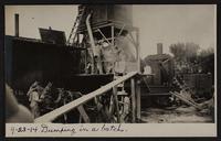 Applying asphalt coat to Front Street; view of asphalt plant; roller stuck on Main St.