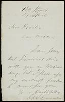 Emerson, Ralph Waldo (1803-1882). Letter to Mrs. Procter declining dinner invitation bur promising to call on her soon. Dated 29 April, [18--?], 142 Strand, [London?]. Manuscript, ink on paper. 1 piece, leaf 18 x 11 cm (writing on 1 page).