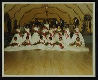 Unidentified group of sixteen girls in white gowns holding red roses arranged in three rows in front of stage