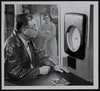 Weather - A. E. Woestemeyer check thermometer. Mrs. Gerald Hadl in background.